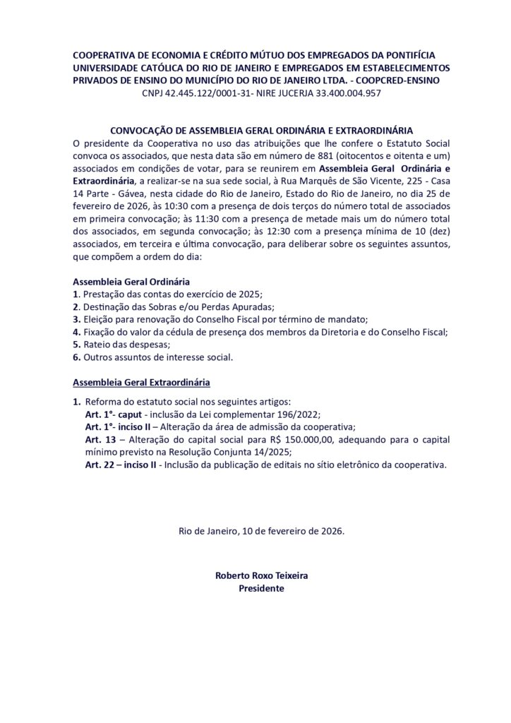 CONVOCAMOS TODO O QUADRO SOCIAL PARA PARTICIPAR DA AGO/AGE 2026 DA COOPCRED-ENSINO, QUE SERÁ REALIZADA NO DIA 25/02/2026, CONFORME EDITAL ABAIXO, PUBLICADO EM 10/02/2026. DISPONIBILIZAMOS TAMBÉM O EDITAL PARA DOWNLOAD A SEGUIR: (CLIQUE AQUI).
